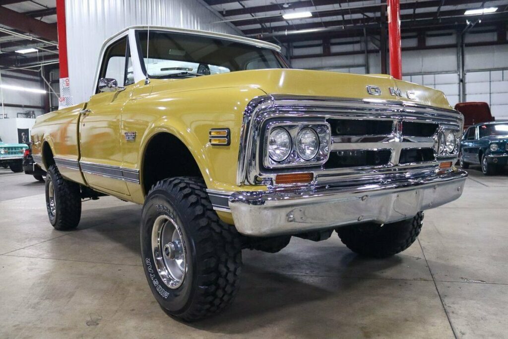 The 1970 GMC Pick up 4 X 4 offered here is a very useful example powered by its 350 V8, automatic transmission and proven 4 Wheel Drive system. The truck was restored 500 miles ago and was removed from the frame at the time. The Truck comes with a detailed photo album that shows the depth of restoration and process. It is finished in its factory Ochre over a neat and tidy interior with new carpet. The truck has a tow package, dual exhaust, 33×12.5R15 tires, power steering and power brakes, headers, beautiful chrome, electric cooling fans, aluminum intake and Holley carburetor.