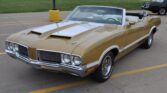 This 1970 Oldsmobile Cutlass Supreme convertible is finished in gold over white vinyl and is powered by a 455ci V8 paired with a three-speed automatic transmission. The body was refinished in gold with during previous ownership and features white stripes, a white soft top, a rear spoiler, chrome bumpers, and dual hood scoops. Factory 14″ styled steel wheels feature gold centers and polished trim rings and wear 215/70 front and 235/60 rear Cooper Cobra Radial G/T tires. This…