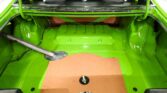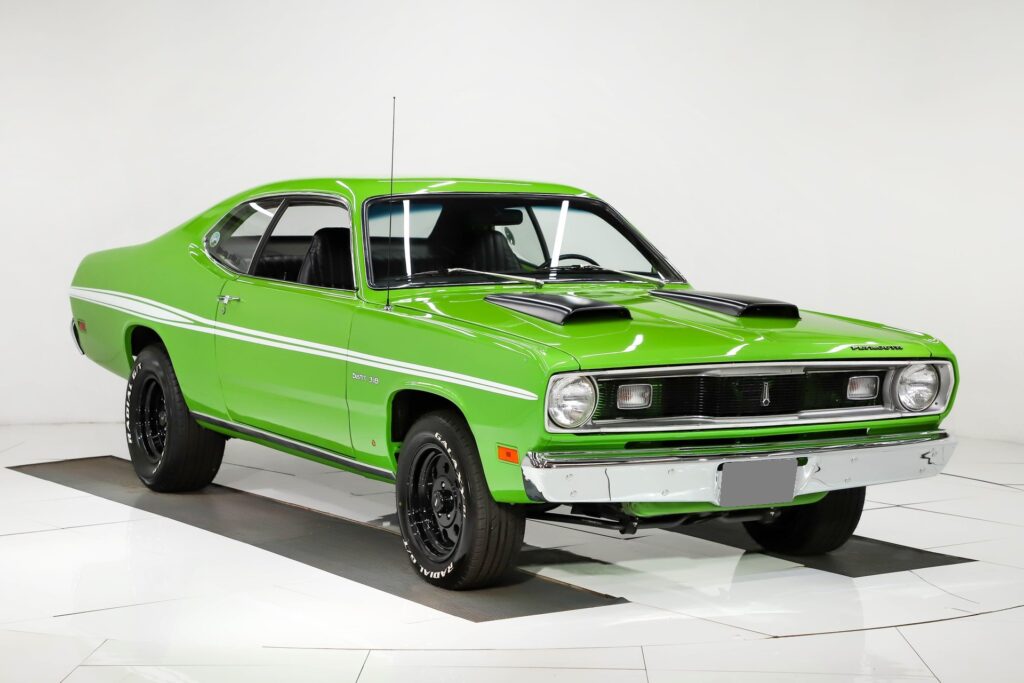 This Duster certainly has the muscle car looks and sound. Less than 500 miles on a ground up restoration. It is very tidy and proper throughout! Recent professional body and paint restoration. It is straight and fits great, no rust or damage. Painted high impact sassy grass green. It has a smooth, glossy finish. Jambs are painted slick. Blacked out hood scoops and new white decal stripes add some sizzle. Most of the glass is new. New weather strips and window seals. Bumpers were rechromed, door handles replaced, stainless trim was polished. New tires and powder coated wheels. INTERIOR: Very clean dash area. New set of white face gauges and tachometer. New glove box liner. New carpet, door panels, seat cushions and upholstery. New headliner, dome light works. Fm cassette actually sounds great, has 6×9 speakers. Very tidy throughout. ENGINE COMPARTMENT: Only 500 miles on a performance built 360 motor. It has reconditioned rods, it was line honed, the crank was turned, Comp cam and lifters, dual plane intake with a Holly Street Demon 625 carb. The heads were rebuilt. Upgraded aluminum 3 core radiator. Overall clean and proper. Components look new, battery is bolted down, horns are hooked up. Clean metal painted glossy. TRUNK COMPARTMENT: All clean metal that’s been painted glossy green. New weatherstrip and spare tire divider board. UNDERSIDE: Upfront the steering components look fresh. New steering box, swaybar, springs and shocks. In back it has new Mopar leaf springs and air shocks. Pypes 2 1/2 inch stainless exhaust system. 10 inch drum brakes, hoses were replaced. E-brake is hooked up. Fuel tank looks clean. Looking up at the motor it has an anodized oil pan and a high torque starter. Rebuilt 904 Torqueflite automatic. The floors and frame rails are clean metal.