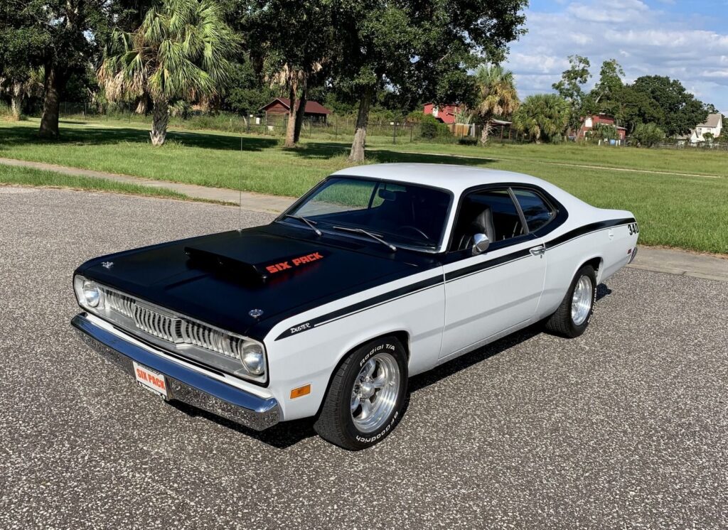 340 V8 engine, 6 pack carburation with Holley Carburetors, headers, dual exhaust, MSD electronic ignition, aluminum radiator with electric fan, power steering, front disc brakes, 4 speed manual transmission, American Racing Torque Thrust II polished alloy wheels, BF Goodrich white letter radial tires, white exterior, black stripe package, Six Pack hood, Shark Tooth Grill, chrome driver’s mirror, black bucket seat interior, Autometer Gauge package, Tuff steering wheel, Hurst Pistol Grip Shifter, Vintage Air Conditioning, Pioneer AM/FM/CD radio.