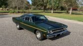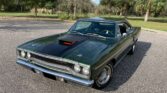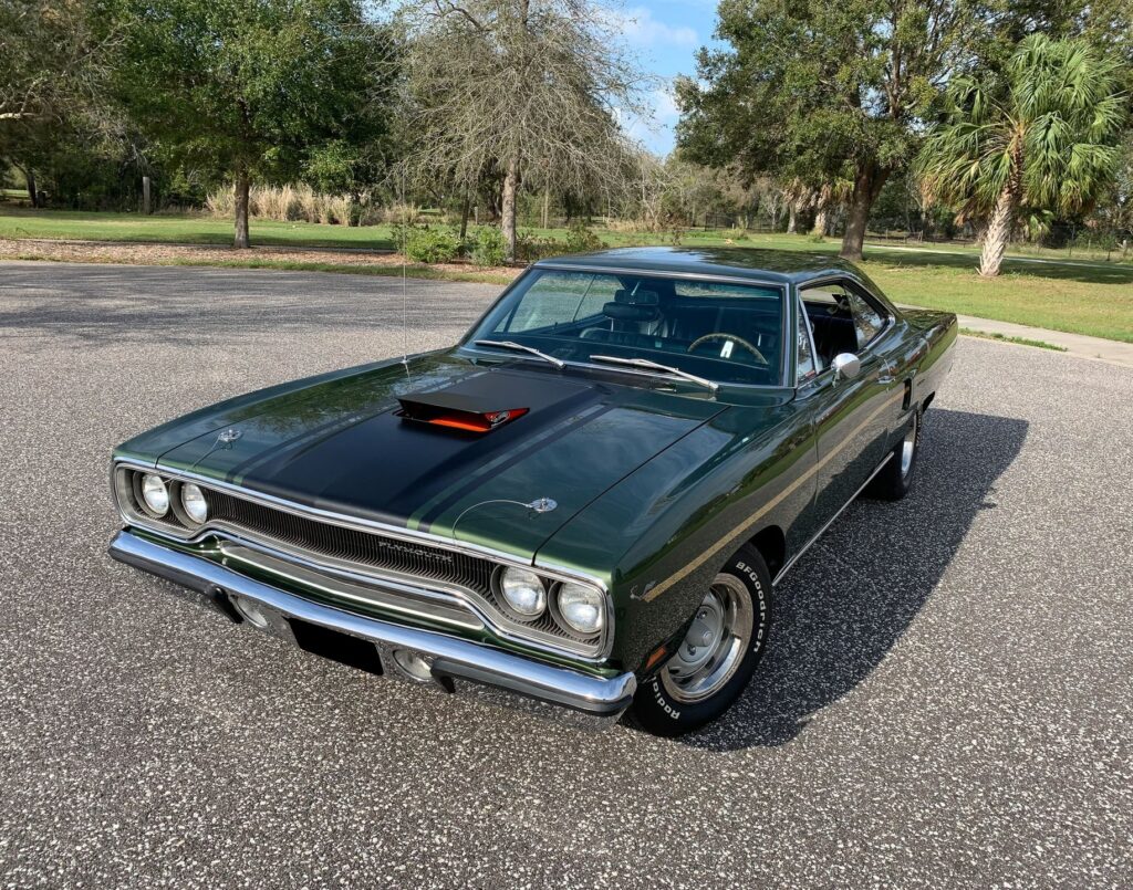 True Super Track Pak Hemi Car. Numbers matching dual quad 426 Hemi V8 engine block factory rated at 425 horsepower, detailed engine bay, max cooling package with 26” radiator, original A833 Hemi 4 speed manual transmission, 4:10 Dana rear end, front power disc brakes, 15” Rally Wheels with BF Goodrich white letter radial tires, F8 Ivy Green metallic exterior with gold stripe package, N96 fresh air package hood with pins, chrome driver’s mirror, original black bench seat interior, wood grain steering wheel, original mats, Pistol Grip Shifter, Rally Dash with tachometer, factory Music Master AM radio, build sheet, Galen Govier Documentation. Only 59 Hemi 4 speed cars were built for the US market, and this car is 1 of 1 with it’s unique options and one of the few 70 Super Track Pack Hemi Roadrunners with it’s original engine. Most of the 4 speed cars were purchased for drag racing and are rarely seen with the original engine.