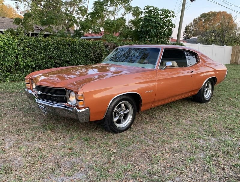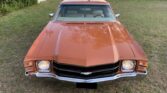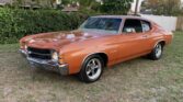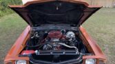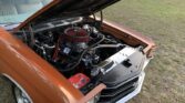 454 Cu In V8 engine (built fast and reliable), detailed engine bay, chrome engine accessories, cold air conditioning, aluminum radiator with dual electric fans, aluminum intake, Holley 4 barrel carburetor, HEI electronic ignition, headers, 3” dual exhaust with Spintech Mufflers, TH400 3 speed automatic transmission, power steering, SSBC front power disc brakes, 15” American Racing Wheels with radial tires, Correct Code 62 Burnt Orange metallic exterior, chrome mirrors, Code 714 Antique Light Sandalwood bench seat interior, in-dash tachometer, auxiliary gauges, upgraded wood rim steering wheel, tinted glass.