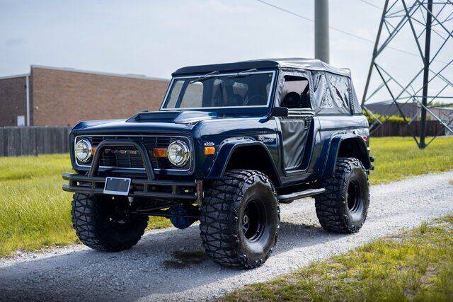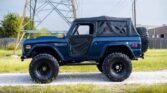 Restored Ford 302ci V8 paired with a C4 automatic transmission. Features custom paint, fiberglass hood, fender flares, chrome accents, built-in roll bar, soft top and soft doors. Equipped with Corbeau sport seating, custom center console, Dakota Digital dash, Hydro-Boost brakes, power steering, upgraded cooling, Wild Horses suspension, and oversized beadlock wheels with matching full-size spare.