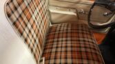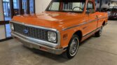 This 1972 Chevrolet C10 Custom Deluxe is a short-bed standard-cab pickup finished in orange over Parchment vinyl upholstery with plaid fabric inserts. It is powered by a 350ci V8 paired with a three-speed automatic transmission and equipped with power steering, power-assisted brakes, a tilt steering column, and an aftermarket cassette stereo.