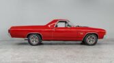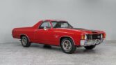 Fully restored 1972 Chevrolet El Camino SS finished in Cranberry Red with black SS stripes and cowl hood. Powered by a 350ci V8, 4-speed manual with Hurst shifter. Features cold AC, power windows, locks, tilt wheel, and SS gauges. Stunning chrome-detailed engine bay and undercarriage with upgraded suspension. Black vinyl interior fully redone. Rides on factory 15” SS wheels with Goodyear Eagle GT tires.