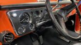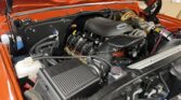 This car is powered by a replacement 5.3-liter Vortec V8 paired with a four-speed automatic transmission and a dual-range transfer case. Equipment includes an Off Road Design suspension, 18″ wheels, Flowmaster exhaust, an aluminum radiator, air conditioning, cruise control, Dakota Digital gauges, and a Bluetooth stereo. A subsequent refurbishment is said to have included rust repair, replacing the side sills, patching the quarter panels, repainting the body in Viper Orange, and reupholstering the interior in black vinyl with plaid inserts.