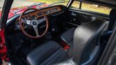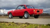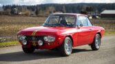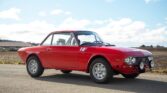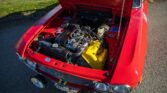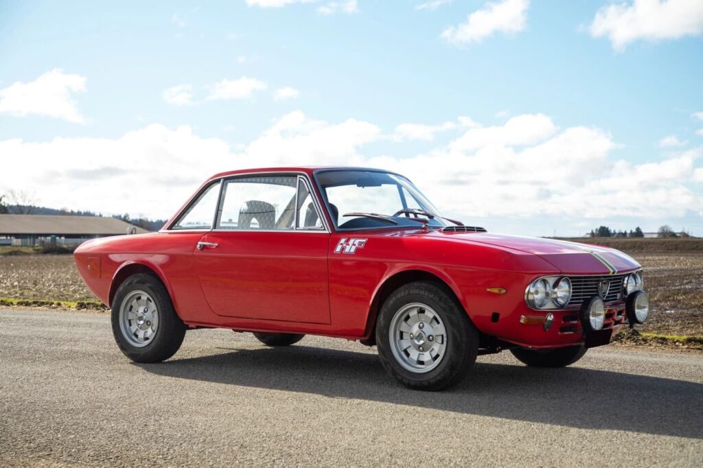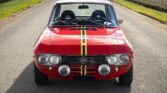 Powered by a 1,584cc V4 mated to a five-speed manual transaxle, this car is finished in red over black upholstery. The exterior is refinished in Rosso Corso with blue and yellow stripes. The bumpers have been removed, and additional exterior details include refurbished Carello driving lights, HF fender badges, a driver-side mirror, a locking fuel door, and LED taillights.