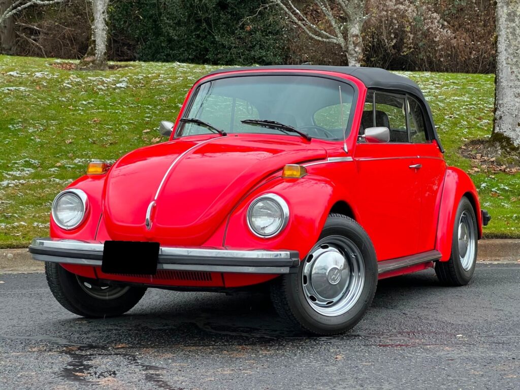 Iconic 1974 Volkswagen Super Beetle Convertible in Phoenix Red with black interior and soft top. Believed 16,000 original miles, one-owner history, and softly restored with new paint, top, and interior. Powered by a 1600cc air-cooled engine and 4-speed manual—runs and drives like new. A collectible, turn-key classic.