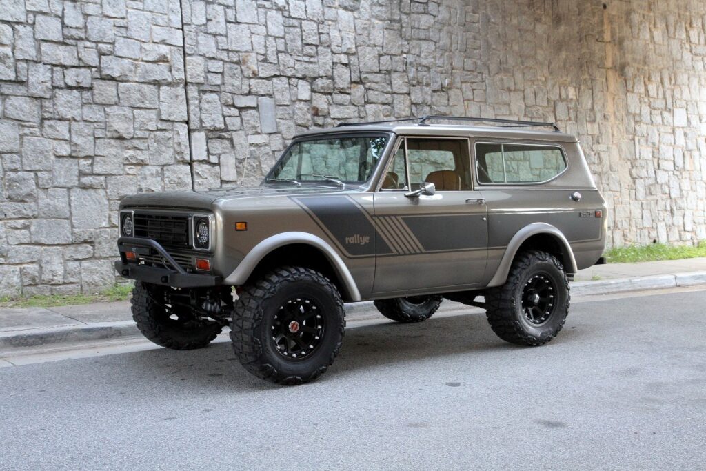1976 International Harvester Scout II Rallye finished in platinum metallic with matte black stripe. Powered by a rebuilt 345 V8 with Holley carb and TorqueFlite 727 automatic transmission. Features 4WD, power steering, power disc brakes, LED headlights, new wheels and tires, and refreshed saddle interior with modern stereo. A well-restored classic SUV that runs and drives great.