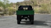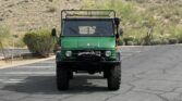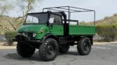 This is a 1978 Mercedes-Benz Unimog 416 Cabriolet. “Mogs” are best known for their ability to traverse terrain of all sorts, and this model has desirable features that set it apart from the other Unimogs one might find. This model offers a 5.7L inline-6, 4-wheel drive, vinyl roof, and a drop-side bed with custom tool box and appears to be well taken care of, judging by the overall condition of the interior and the exterior. The exterior is finished in green and black, which appears to be the original color from the factory.The paint has great shine and looks fantastic from 15 feet away. The black manual-folding canvas soft top shows and operates well. All of the components underneath are either repainted black or hold their original black appearance from the factory, including the two gas tanks, with the Mercedes-Benz three point star on the caps. Upon inspection, you’ll also find a bright red master switch that acts as a full power cutoff from the two battery setup. It also is difficult to miss the gigantic Continental tires and the dual winch setup, which makes this a very capable rock-crawler. This Unimog is also set up to be a personnel carrier with a bench for seating in the fold-down bed of the truck, with seatbelts, and a storage box underneath.