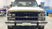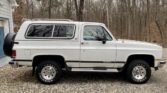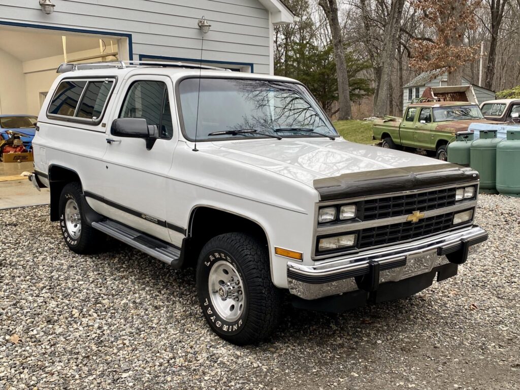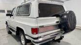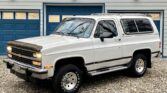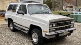 This 1991 Chevrolet Blazer 1500 Silverado is finished in white over blue cloth and is powered by a fuel-injected 5.7-liter V8 mated to a four-speed automatic transmission and a dual-range transfer case. Equipment includes a removable color-matched hardtop, optional 15″ cast-aluminum wheels, a full-size spare tire with a swing-out rear mount, locking front hubs, a rear receiver hitch, running boards, mud flaps, a roof rack, power windows and door locks, and a Delco cassette stereo.