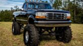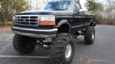 This 1993 Ford F-350 XLT is a regular cab 4×4 example that is finished in black over gray cloth and powered by a 7.5-liter V8 paired with a four-speed automatic transmission, a dual-range transfer case, and a limited-slip rear differential. Additional equipment includes suspension and body lifts as well as 16.5? Weld Racing wheels, dual fuel tanks, a spray-in bedliner, a chrome roll bar, a sliding rear window, air conditioning, and a JVC CD stereo.